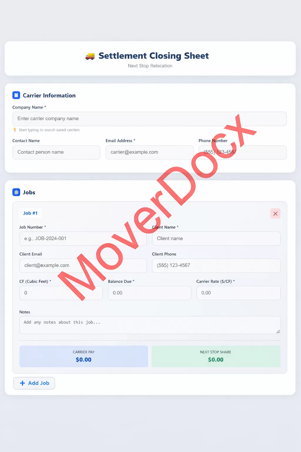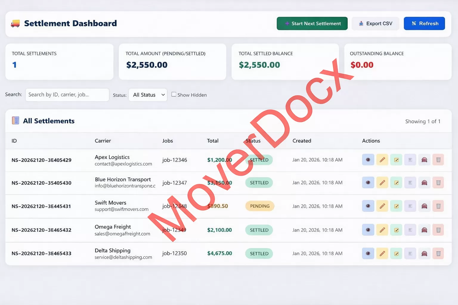 Replace paper settlement sheets forever. Track carrier pay, job totals, balances, and commissions in one secure dashboard.